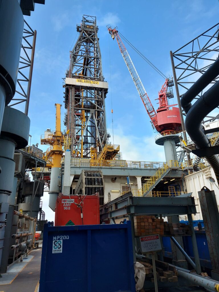 The Valaris Ju122 is a modern three legged super “A” class rig, purposely designed to drill in harsh environments. It has an International Maritime Organisation (IMO) number: 8771629 and ABS Class: ABS-A1-MODU. The rig can operate in waters to 450ft deep and drill down to depths of 35,000ft.